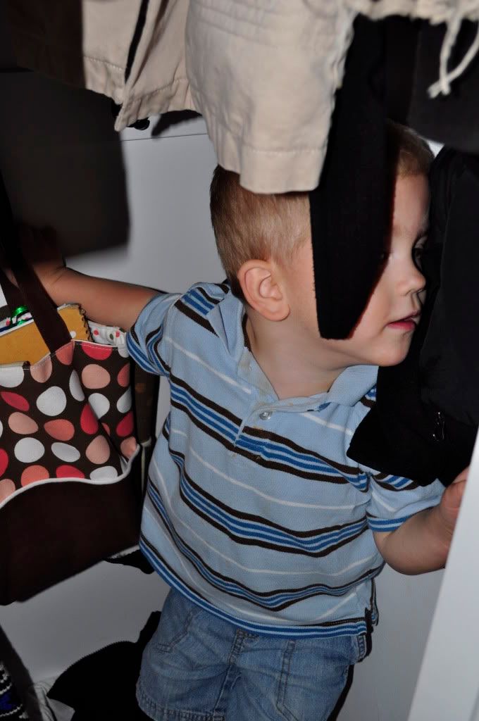 Photography:  I read a children's photography article and one of their main points was to be on the child's level, which at first seemed obvious to me.  However, the author then said that you should not always be at eye level, but be creative with other angles (like below, or taking shots from the toes up, including other important scenery in the frame, etc.)  What I like about this picture is that you can see all the items in the closet...bags, jackets, shoe basket.