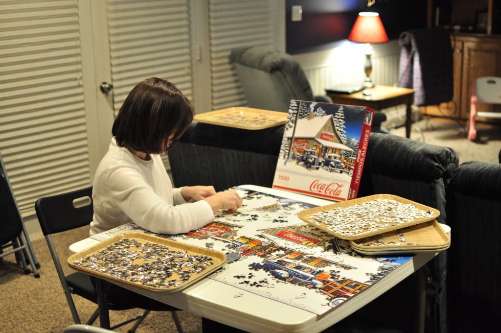 Jon's family has always done a huge puzzle between Christmas and New Years.  Everyone helps in shifts, but Trudy is always the most patient and determined to finish.  And the least likely to want her picture taken!  This was a 1500 piece one and we got three quarters done in one night!